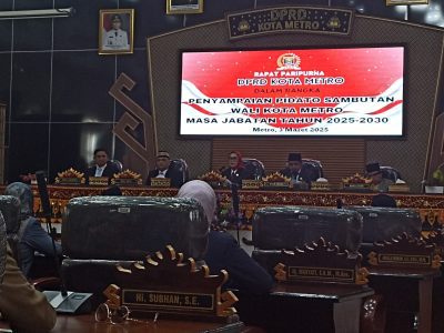 Metro | Dewan Perwakilan Rakyat Daerah (DPRD) Kota Metro Gelar Rapat Paripurna Dalam Rangka Penyampaian Pidato Sambutan Walikota Metro Masa Jabatan Tahun 2025-2030, di Aula paripurna gedung setempat, Senin (03/03/2025).