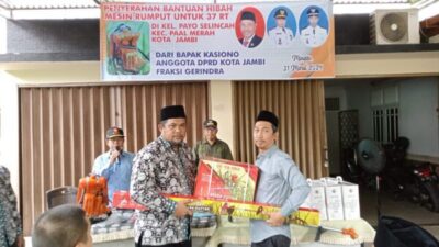 Bapak Kasiono Dalam kata sambutan nya ” Mengucapkan ribuan terima kasih kepada seluruh ketua RT yang telah memberikan bantuan moril sehingga saya dapat duduk kembali di DPRD Kota Jambi, dan sesuai janji saya akan memberikan bantuan mesin rumput pada hari ini”.