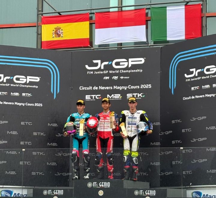 Jakarta – Satukomando.com Pebalap binaan PT Astra Honda Motor (AHM) kembali cetak sejarah untuk Indonesia. Setelah sebelumnya Veda Ega Pratama menang di RedBull Rookies Cup (RBRC) Italia, saat ini giliran M. Kiandra Ramadhipa yang tampil memukau dalam gelaran FIM JuniorGP World Championship yang berlangsung di sirkuit Magny-Cours, Prancis pada 5-6 Juli 2025. M. Kiandra Ramadhipa berhasil melaju kencang dan mencetak sejarah dengan meraih podium tertinggi dalam race pertama balap European Talent Cup (ETC). Raihan Ramadhipa sekaligus menjadi prestasi pertama pebalap Indonesia di balapan bergengsi benua Eropa ini.