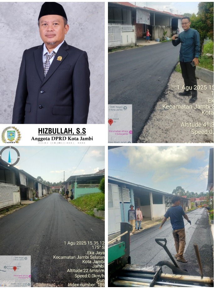 Jambi – Satukomando.com Proyek pengaspalan jalan lingkungan di Perumahan Kampoeng Kito 1 RT 05, Kelurahan Bakung Jaya, Kecamatan Palmerah, Kota Jambi, menjadi sorotan positif warga setempat. Proyek yang merupakan bagian dari program Prasarana, Sarana, dan Utilitas Umum (PSU) ini dikerjakan oleh Dinas Pekerjaan Umum (PU) Kota Jambi dan didanai melalui Pokok Pikiran (Pokir) Anggota DPRD Kota Jambi, Bapak Hizbullah, S.Si.