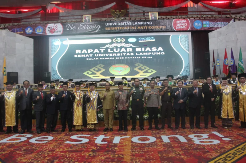 Rapat Luar Biasa Senat Universitas Lampung Dalam Rangka Dies Natalis Ke-59 ini merupakan kegiatan puncak dari perayaan hari jadi Unila ke-59 dengan tema “Be Strong: Transformasi Unila untuk Indonesia Emas”.
