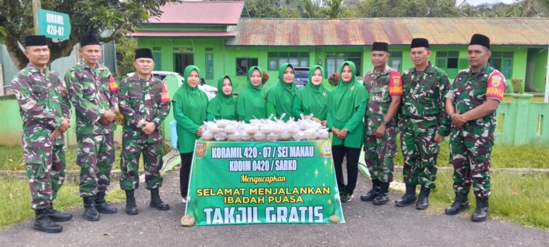 Satukomando.Merangin.com,,, Rabu 05 Maret 2025 – Dalam rangka menyemarakkan bulan suci Ramadhan, Kodim 0420/Sarko melalui Koramil 420-07/Sei Manau melaksanakan kegiatan pembagian takjil kepada warga sekitar. Kegiatan ini dipimpin langsung oleh Danramil 420-07/Sei Manau, Lettu Cba Syafrianto, yang didampingi oleh anggota Koramil serta Persit.